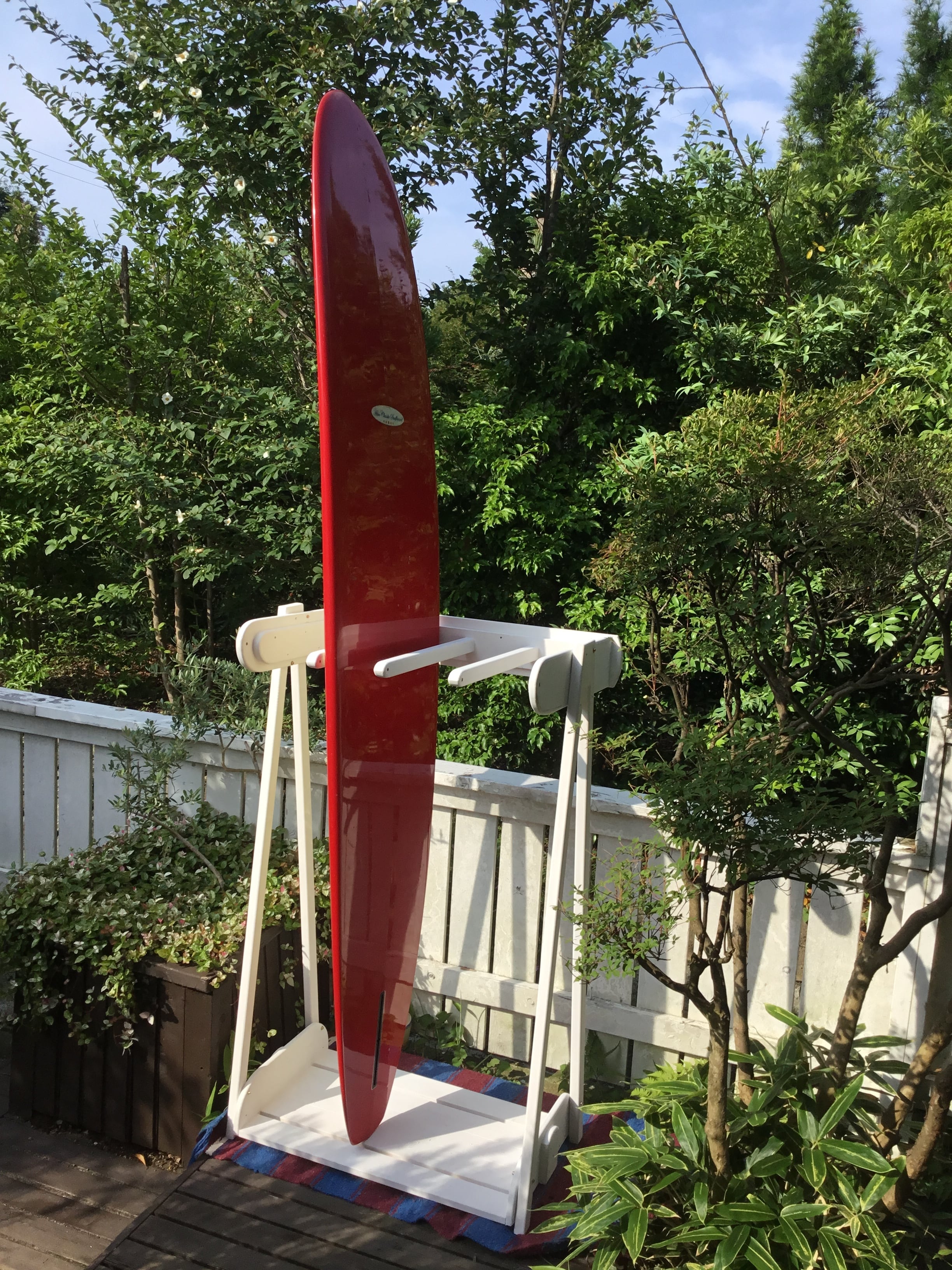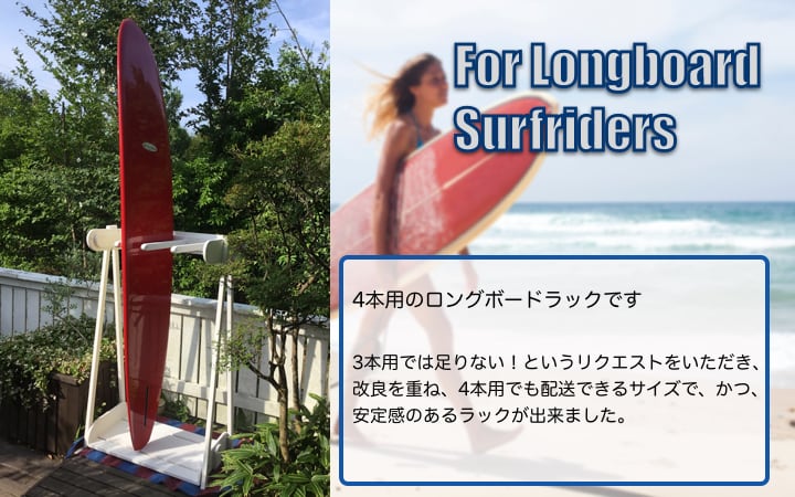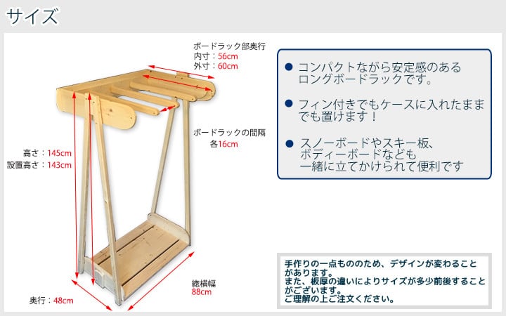 ロングボードラック縦置き4本用のラックです。無垢材を使用しており、シンプルでナチュラルなデザインが特徴です。ロングボードを保管するのに最適なサイズでありながらも、場所を取らずに設置できるので、お部屋のインテリアにもマッチします。